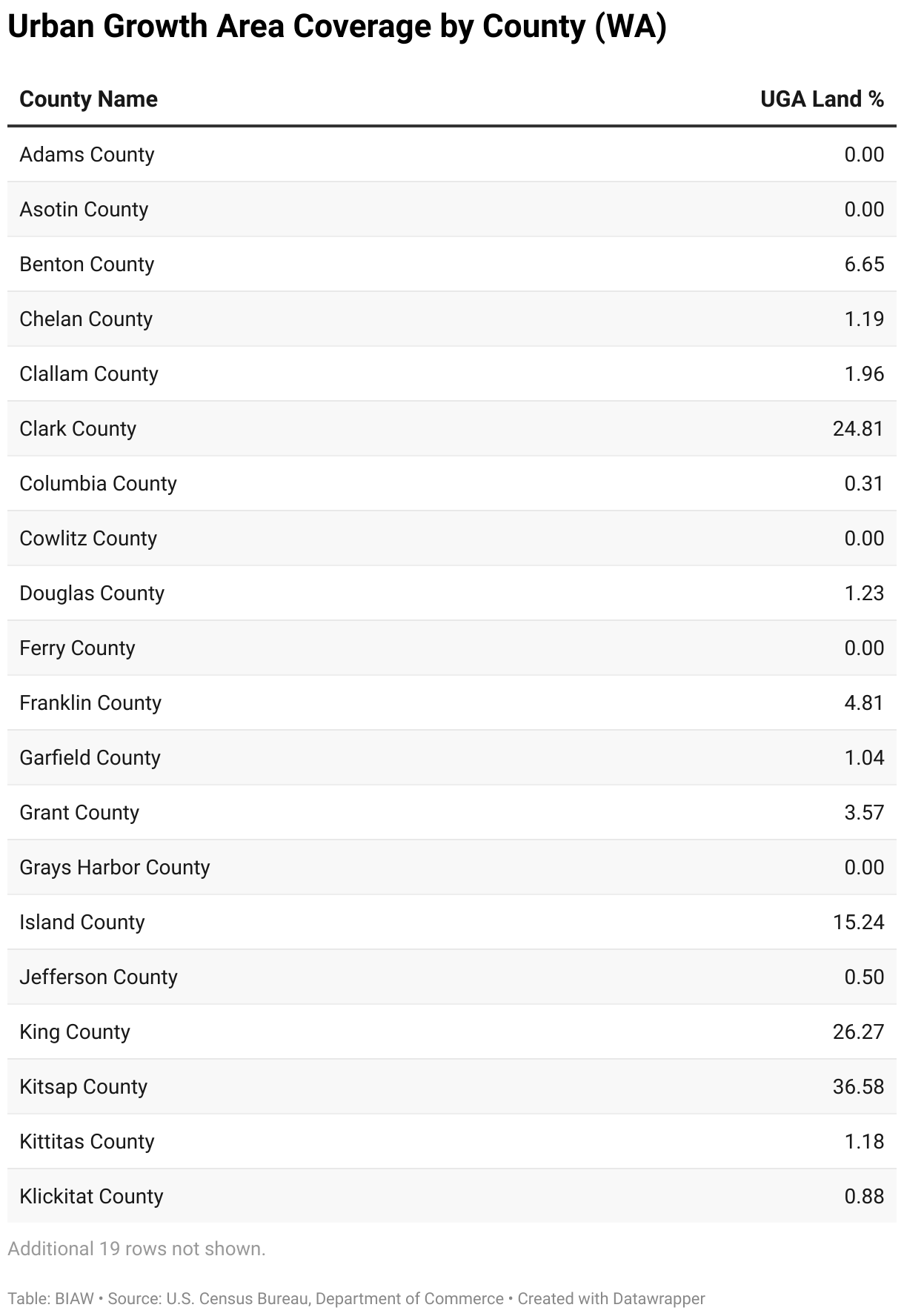 The table below shows the percentage of land within UGAs for each Washington county. Several rural counties do not plan under the GMA and have no UGAs— these contribute to the low statewide average of 3.7%. While some of the state's most populous counties have a higher share of UGA land, most still have less than 25% of their total area designated as UGA, with Kitsap County the only one exceeding 30%.